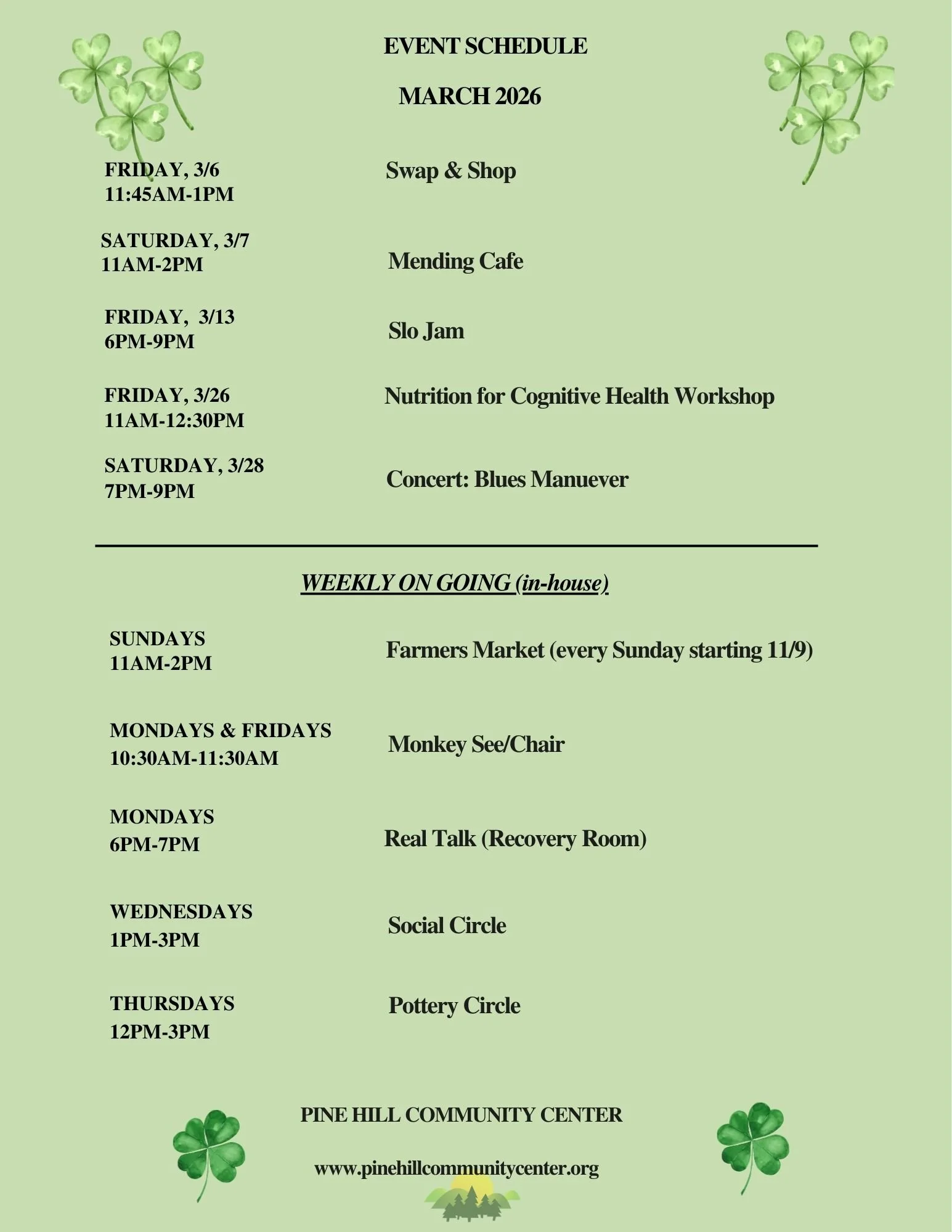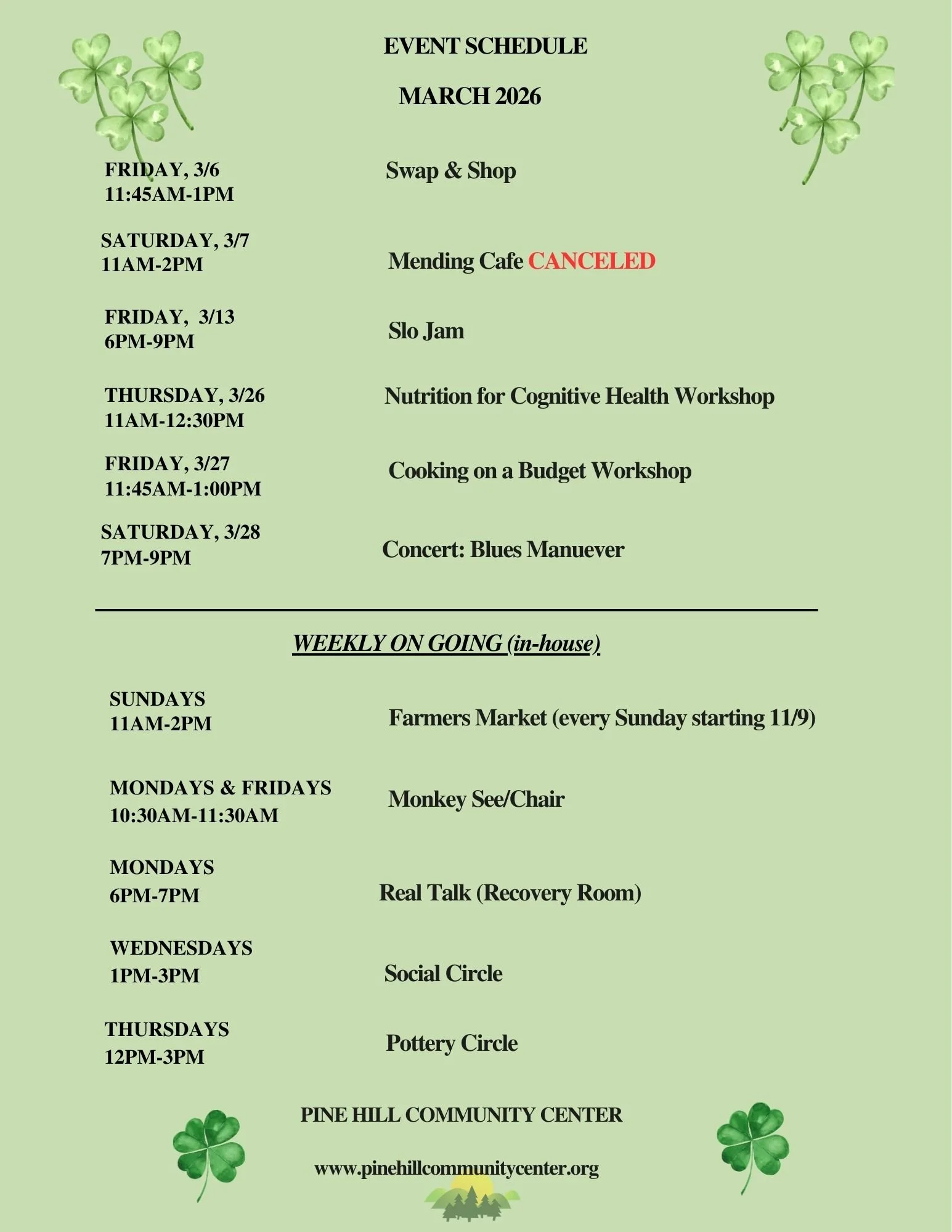 Celebrating 25 years of arts, culture, and community. Sign up for our newsletter HERE What’s On What's On Cooking on a Budget Workshop Nutrition for Cognitive Health Swap & Shop (Artwork, Art Supplies, Crafts) Mending Cafe Blues Manuever Concert MENDING CAFE 2026 CONCERT SERIES (more to come) KITCHEN SWAP AND SHOP JOE COWELL CONCERT Hannaford Community Bag Program Coffee with a Cop Pottery Studio Subscribe Sign up with your email address to receive news and updates. Email Address Subscribe We respect your privacy. Thank you! Suggestion Box