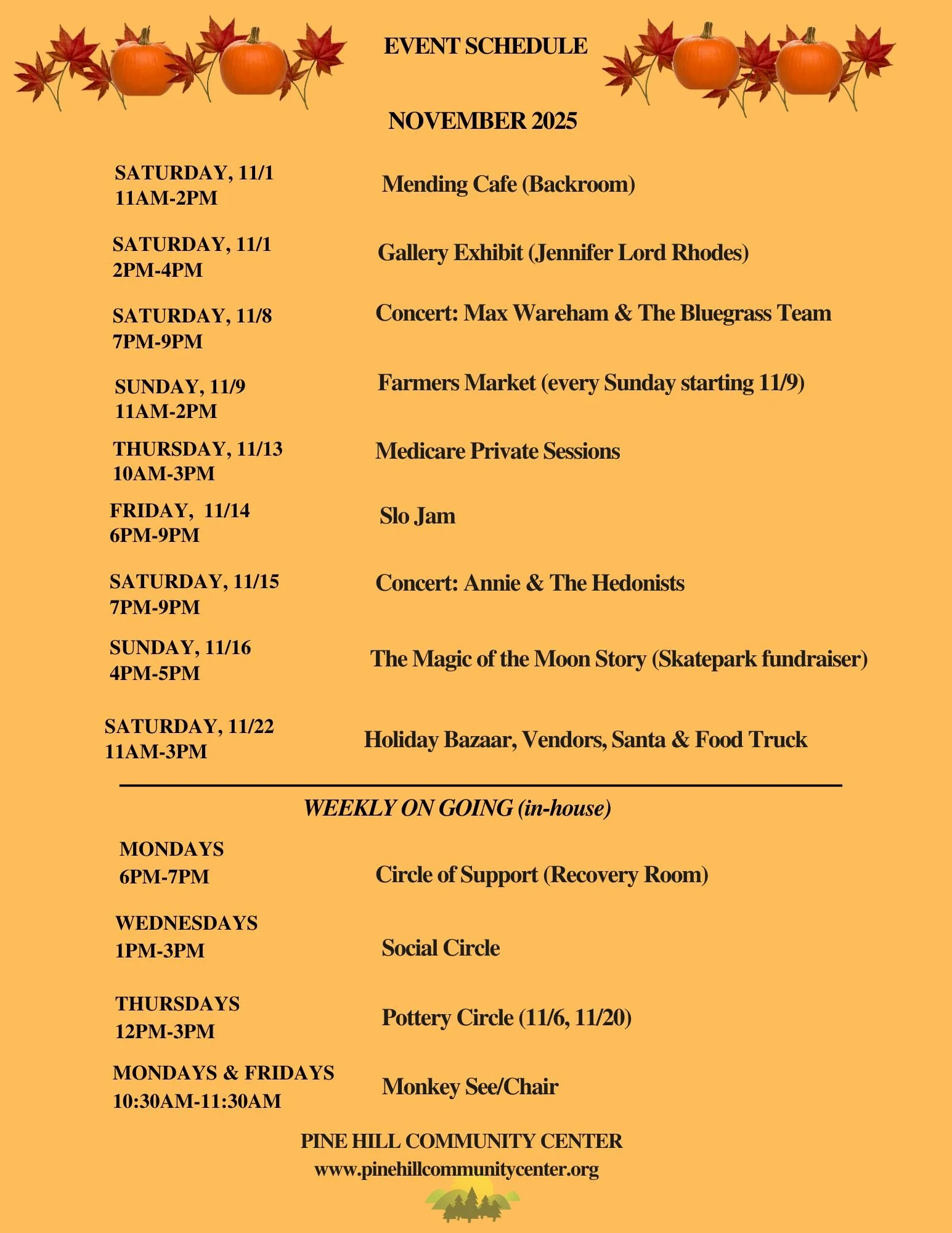 Bringing People Together Through Art & Culture Since 2000. Sign up for our newsletter HERE What’s On What's On Holiday Bazaar Silver Jubilee Farmers Market is back at the PHCC! Annie & The Hedonists Concert Max Wareham & The Bluegrass Team Concert WaterColor Workshop Gallery Opening Circle of Support Ukraine Talk with Michael DiBenedetto Blues Episode Concert Pine-Hill-0-Ween Medicare Counseling with Peggy Eifler Subscribe Sign up with your email address to receive news and updates. Email Address Subscribe We respect your privacy. Thank you! Suggestion Box
